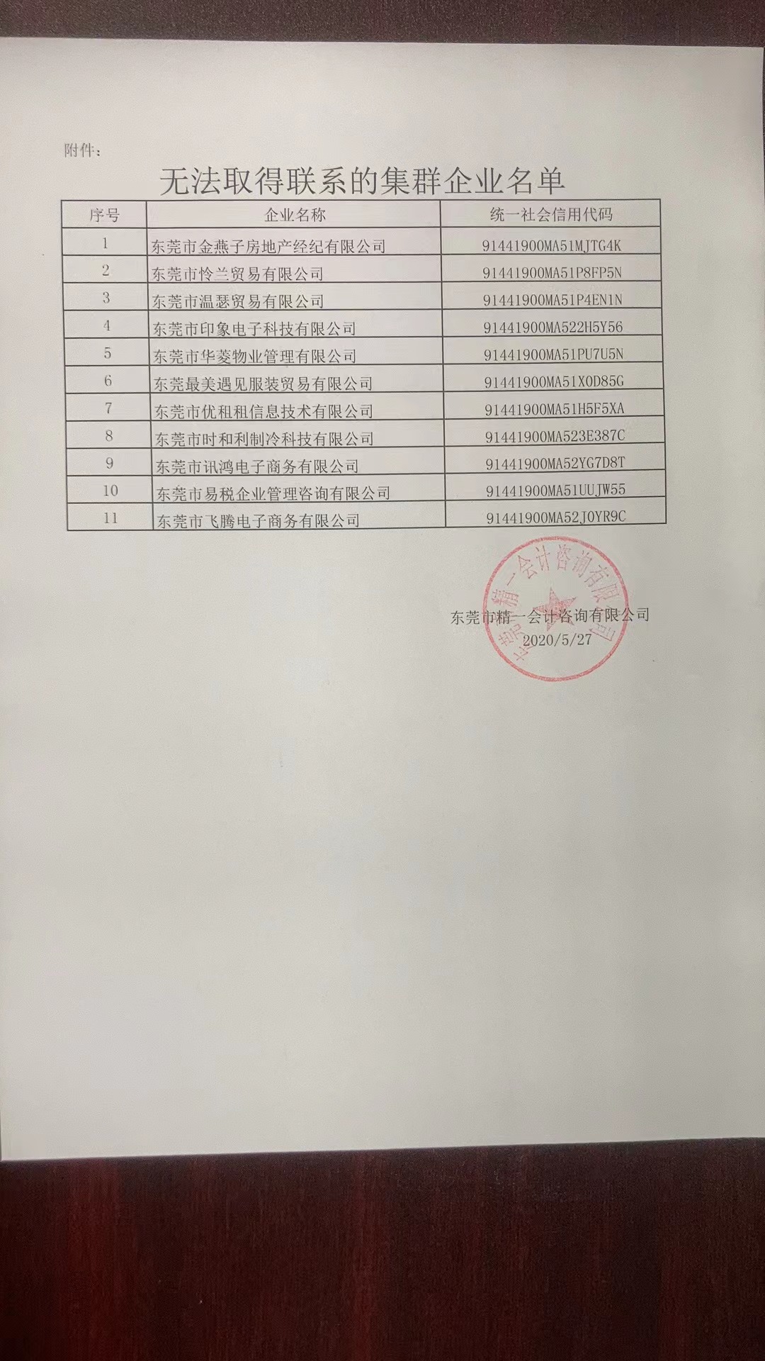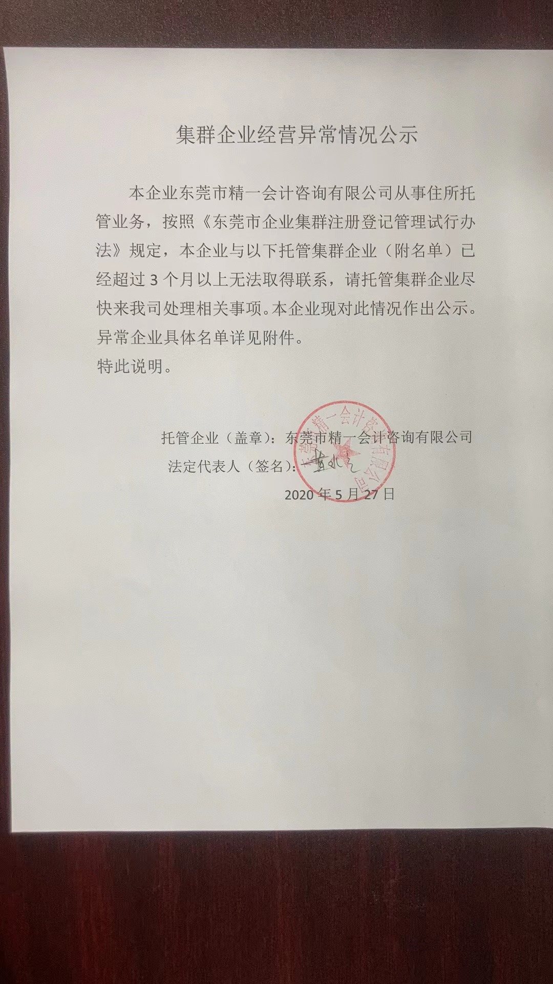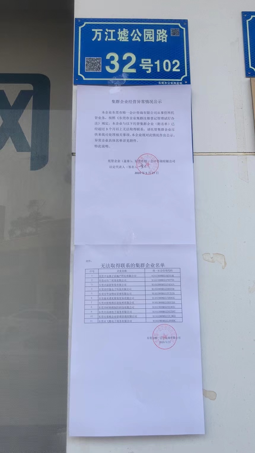 东莞市精一会计咨询有限公司 2020年5月27日 集群企业经营异常情况公示