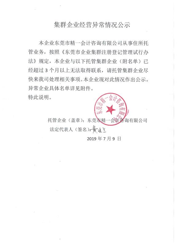 东莞市精一会计咨询有限公司 2020年5月27日 集群企业经营异常情况公示